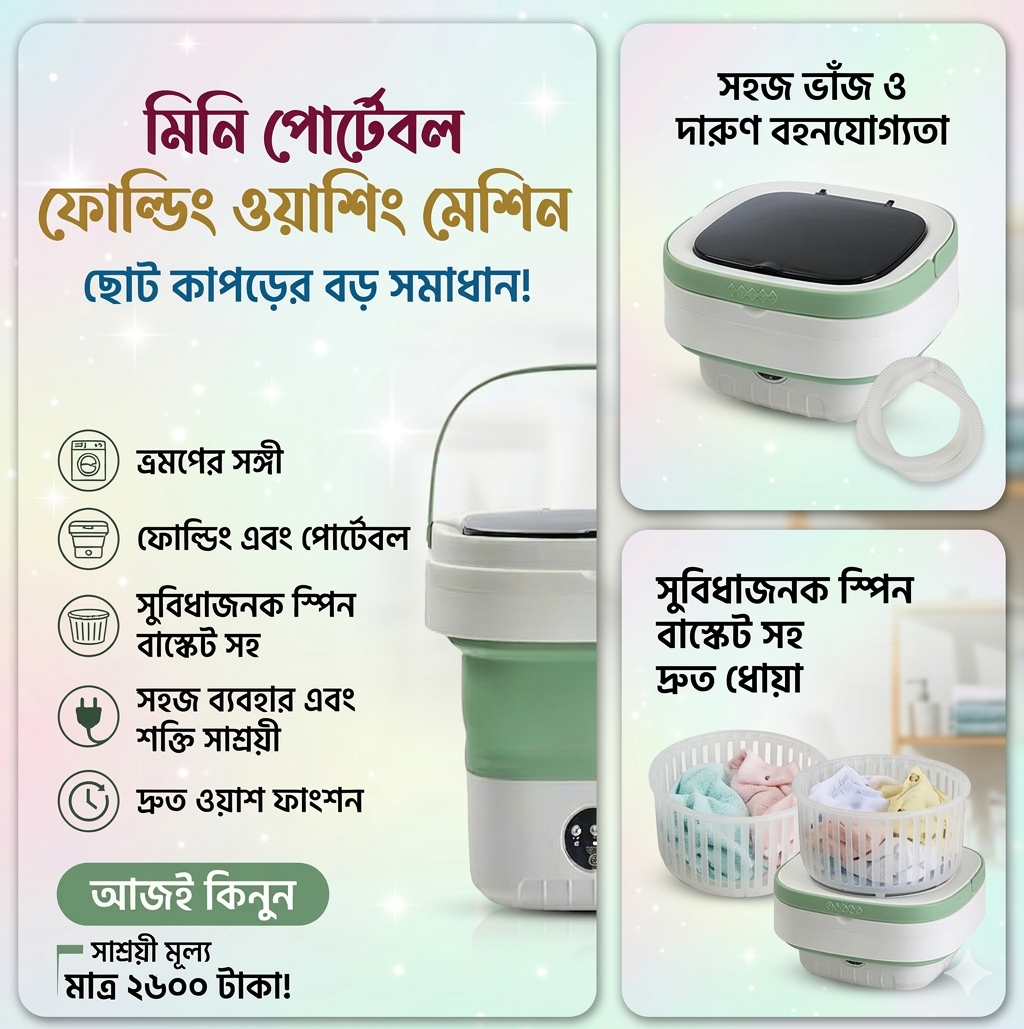 প্রতিদিন ছোটখাটো কাপড় বা বাচ্চাদের ড্রেস ধোয়ার জন্য বড় মেশিন চালানো বা হাতে ধোয়া বেশ কষ্টকর। আমাদের এই পোর্টেবল মেশিনটি মাত্র কয়েক মিনিটে আপনার কাপড় ঝকঝকে পরিষ্কার করে দেবে।