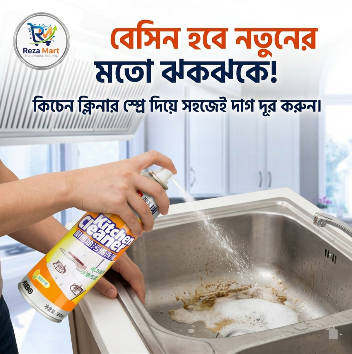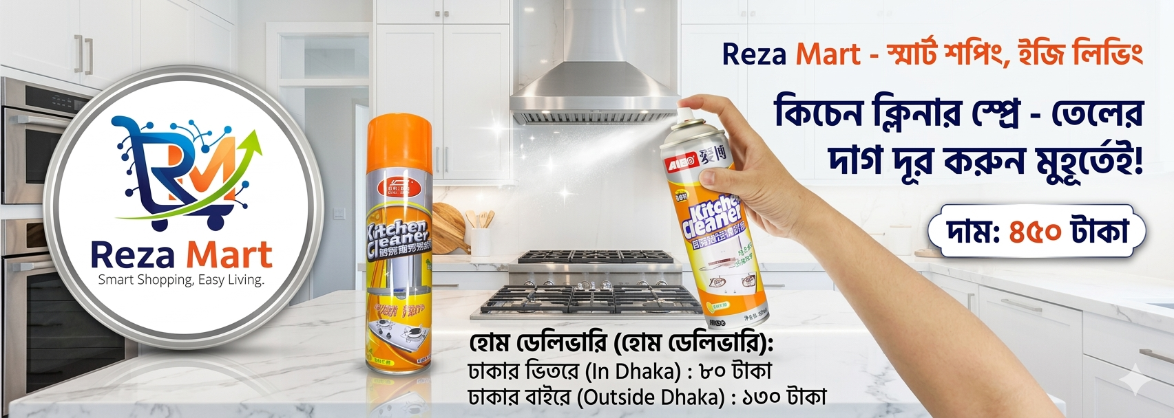 রান্নাঘরের জেদী তেলের দাগ ও চর্বি নিয়ে আর দুশ্চিন্তা নয়! Reza Mart নিয়ে এলো সুপার পাওয়ারফুল কিচেন ক্লিনার স্প্রে। এটি চুলা, চিমনি, টাইলস বা কাবার্ডের যেকোনো কঠিন দাগ মুহূর্তেই পরিষ্কার করে দেবে কোনো হ্যাসেল ছাড়াই।