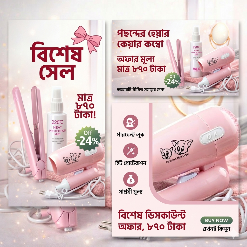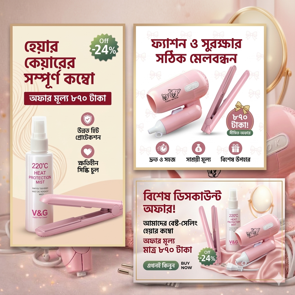 পার্লারের মতো পারফেক্ট লুক এখন ঘরেই! আমাদের এই স্পেশাল কম্বোতে পাচ্ছেন একটি ফোল্ডেবল হেয়ার ড্রায়ার, একটি স্লিম হেয়ার স্ট্রেটনার এবং চুলের সুরক্ষায় ২২০°সে হিট প্রোটেকশন মিস্ট।